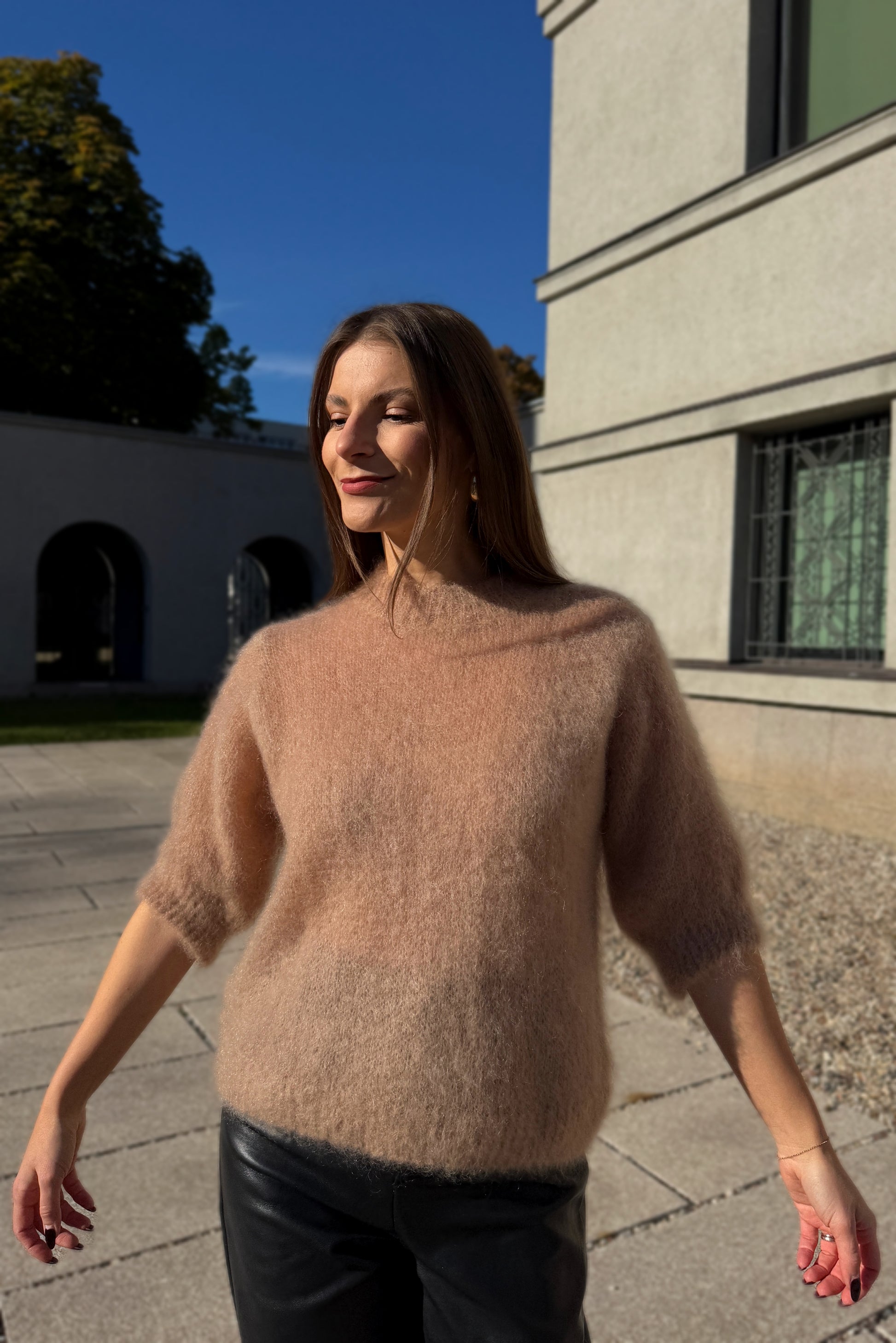 Plonas, purus ir švelnus siūlas kuria jausmą, tarsi būtumėte apsupta minkštos šviesos. Minimalistinis dizainas leidžia megztinį lengvai derinti tiek prie kasdienės, tiek prie elegantiškos aprangos.
